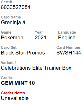 CGC 10 Greninja Celebrations Black Star Promo SWSH 144