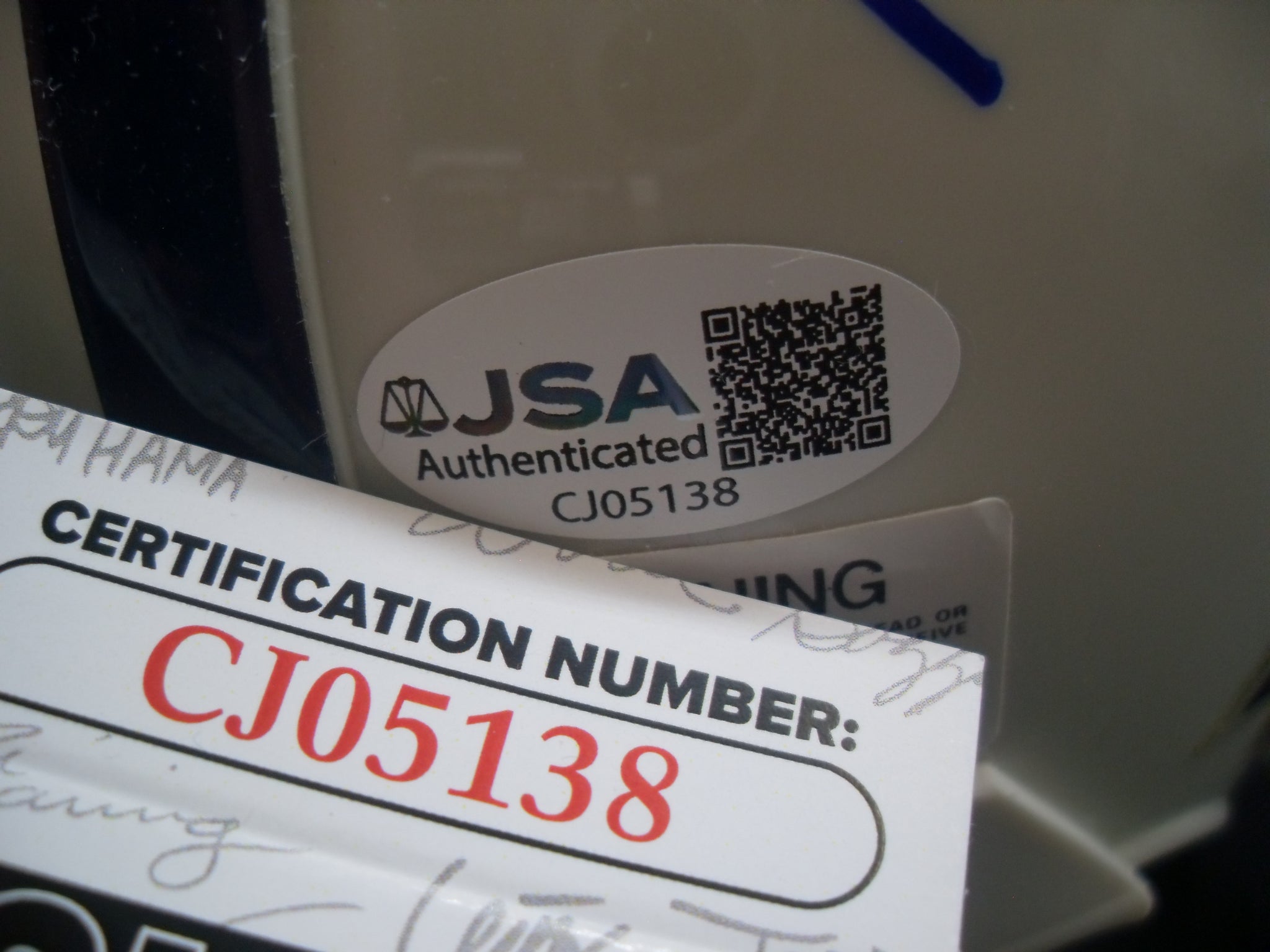 The autograph was authenticated by James Spence Authentication. A tamper proof alpha numeric sticker is on the mini helmet and is accompanied by a matched alpha numeric 3x5 trifold COA card.