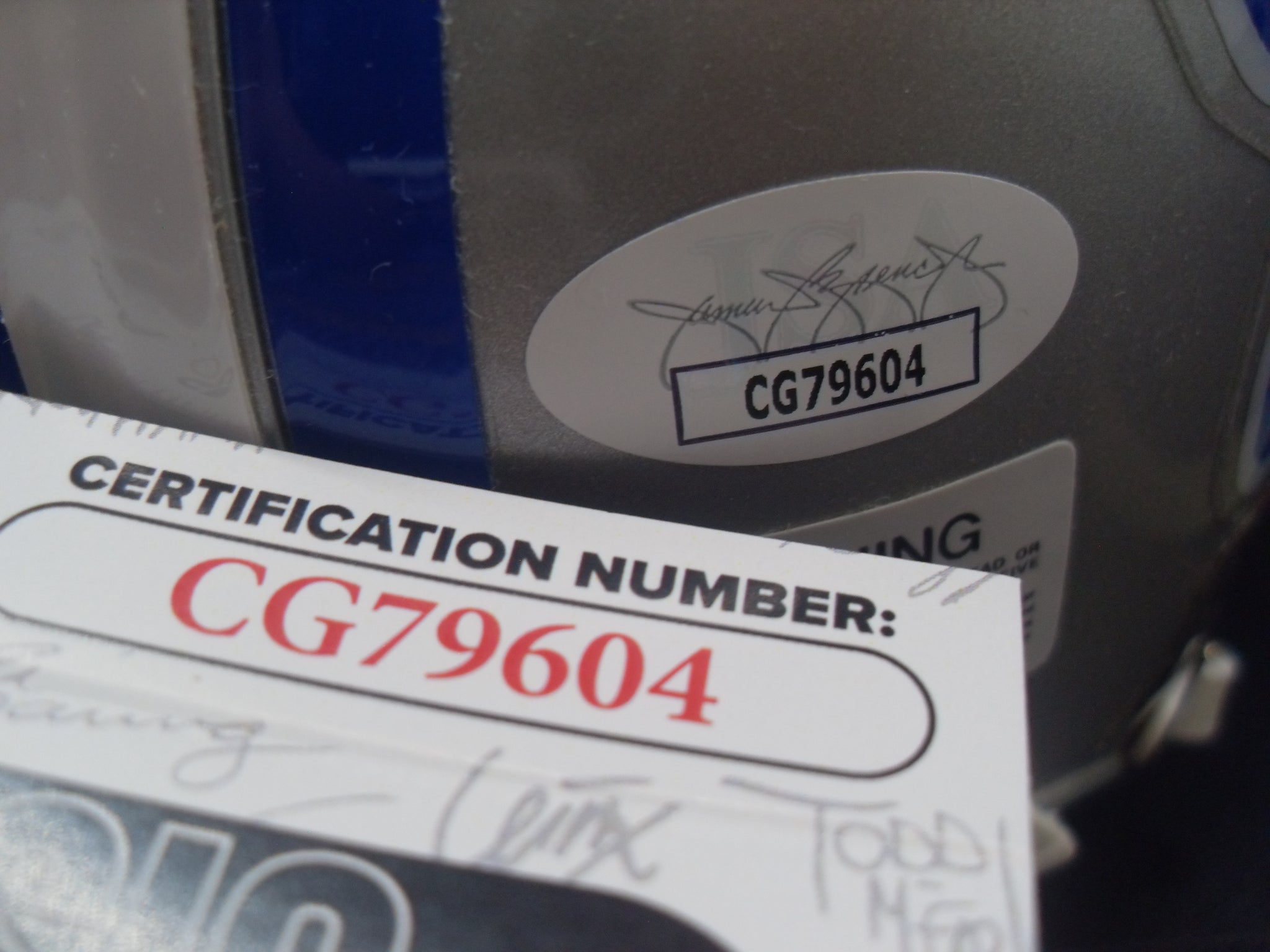 The autograph was authenticated by James Spence Authentication. A tamper proof alpha numeric sticker is on the mini helmet and is accompanied by a matched alpha numeric 3x5 trifold COA card.