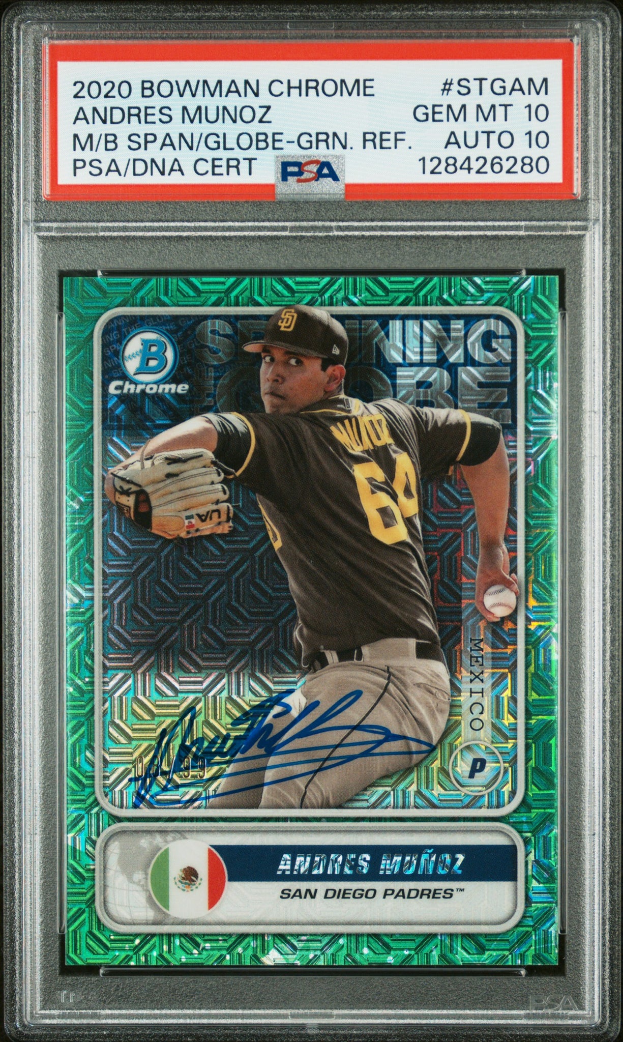 PSA 10/10 2020 Bowman Chrome Mega Box Spanning the Globe Green Refractor #STGAM Andres Munoz RC 8/99 San Diego Padres Autographed POP1