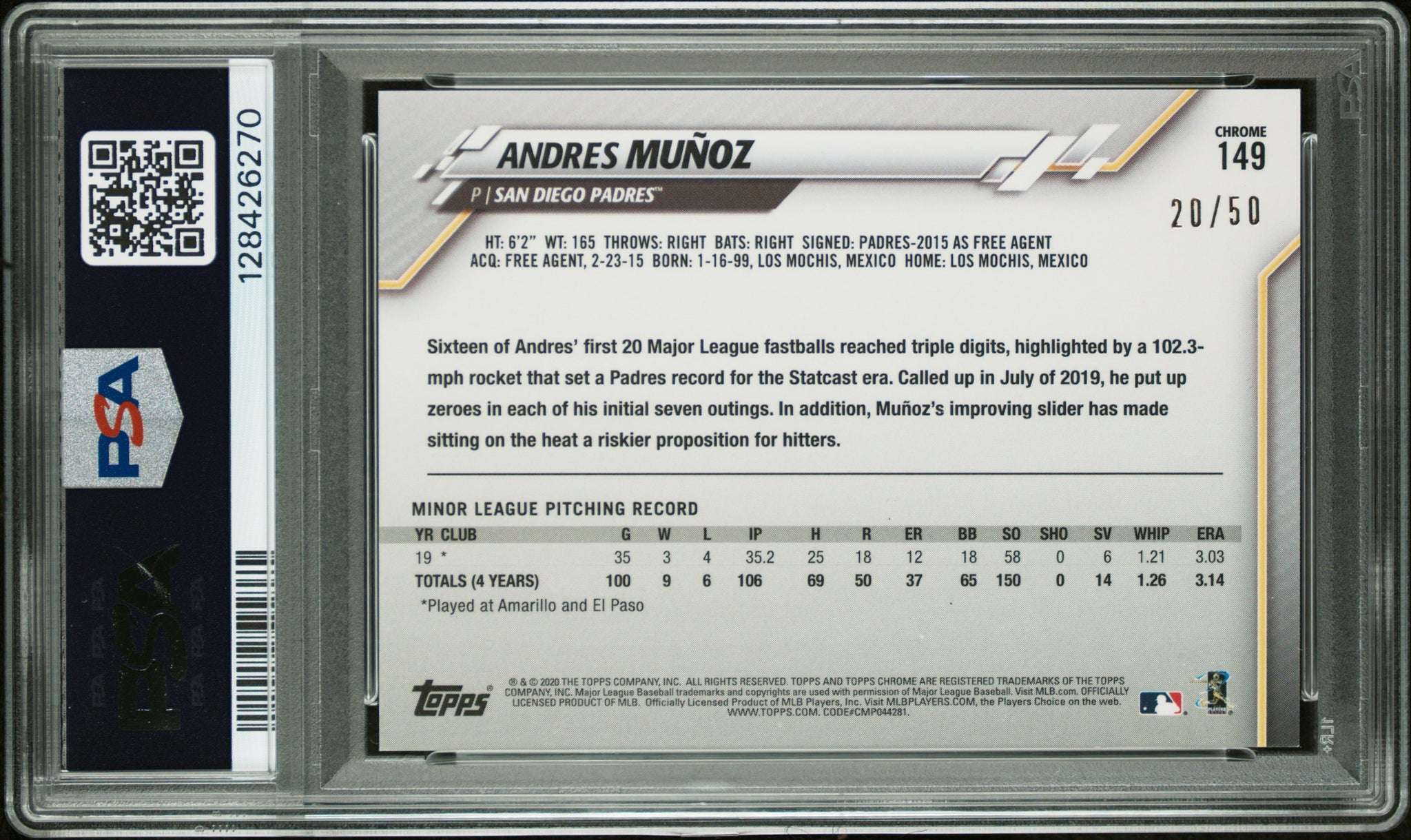 PSA 10/10 2020 Topps Chrome Ben Baller Gold Refractor #149 Andres Munoz RC 20/50 San Diego Padres Autographed POP1