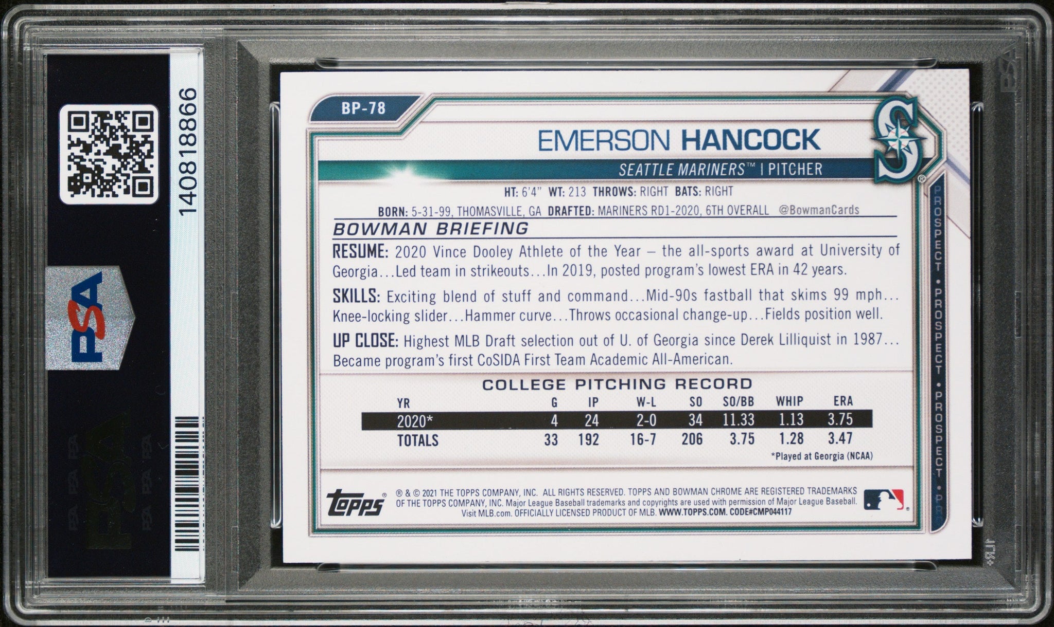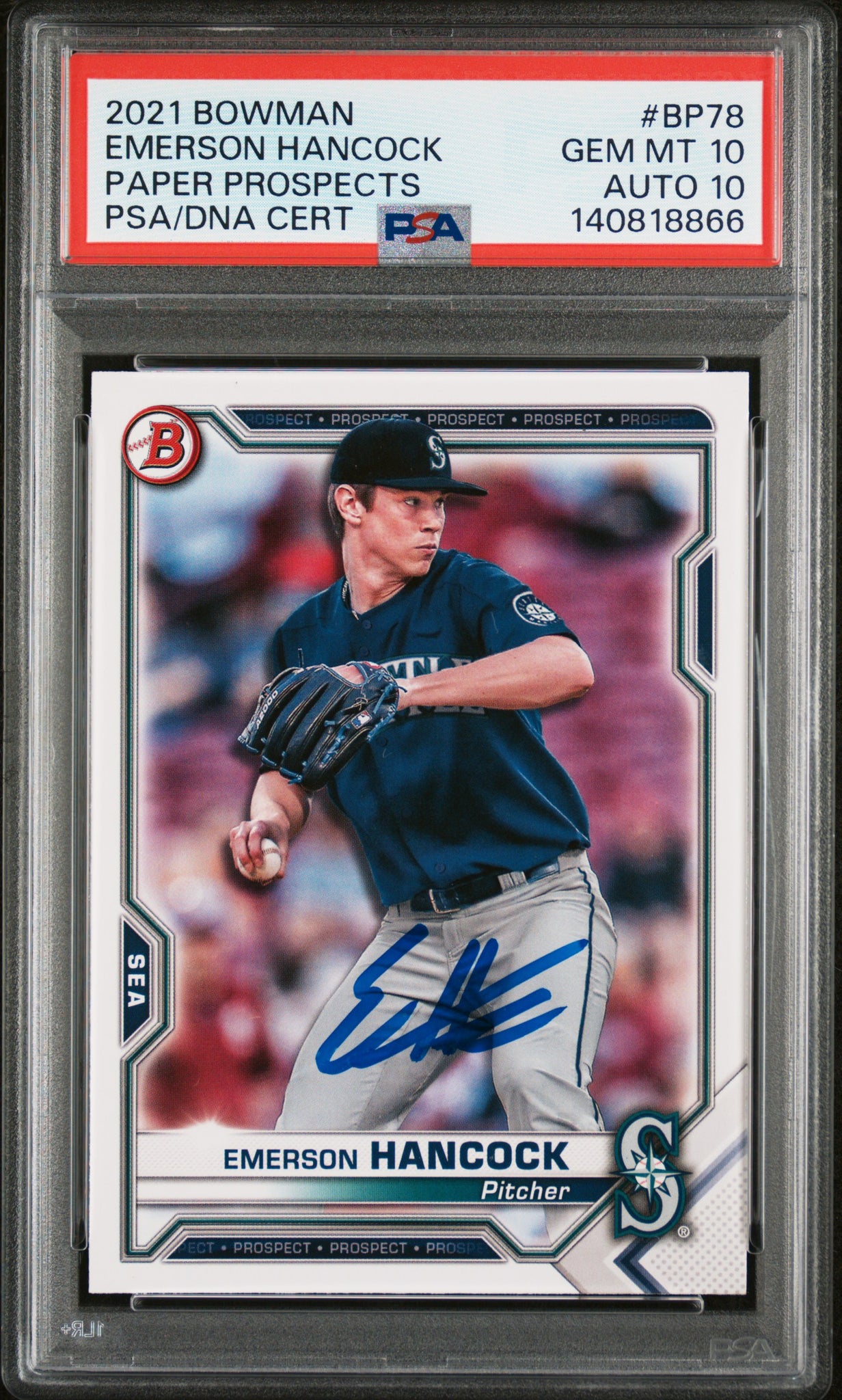 PSA 10/10 2021 Bowman Prospects #BP78 Emerson Hancock Seattle Mariners Autographed POP1