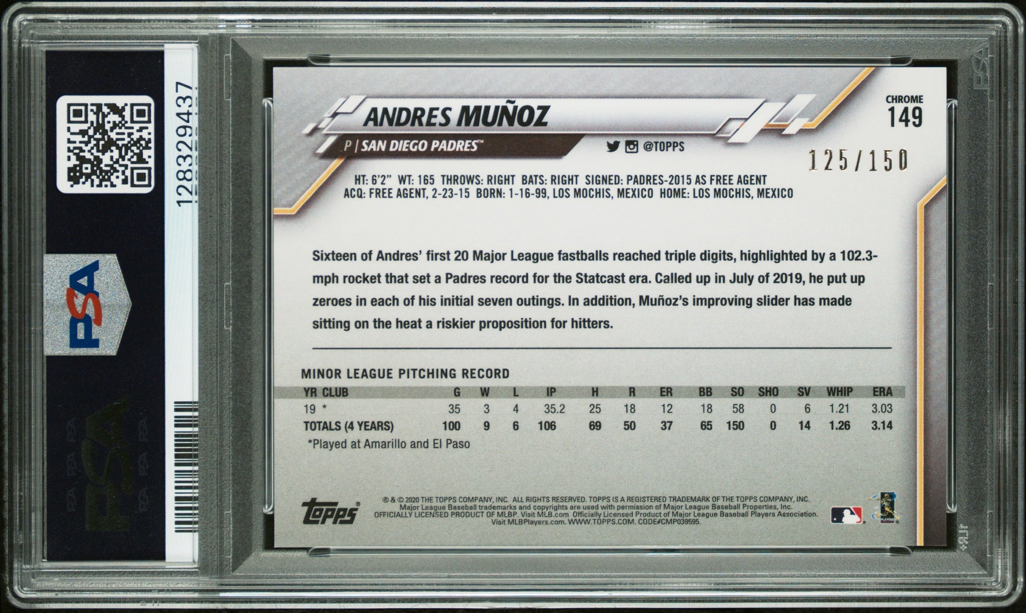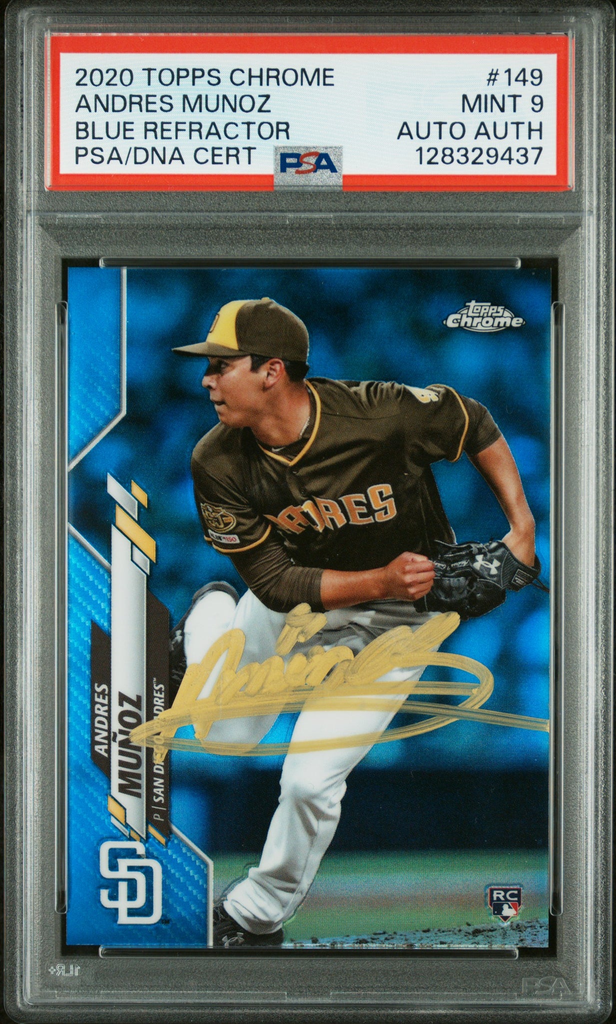 PSA 9 2020 Topps Chrome Blue Refractor #149 Andres Munoz RC /150 San Diego Padres Autographed POP1