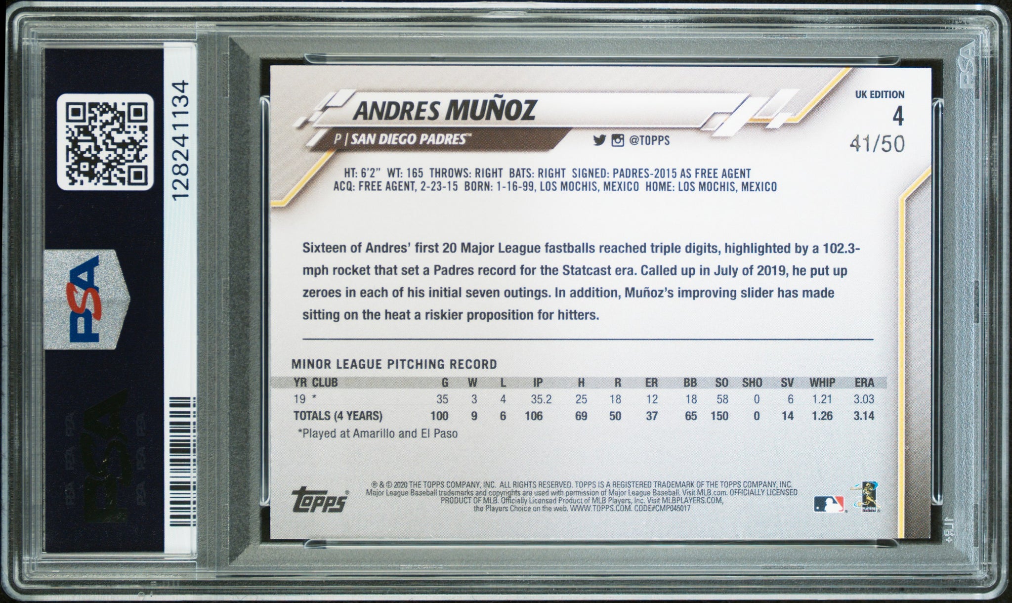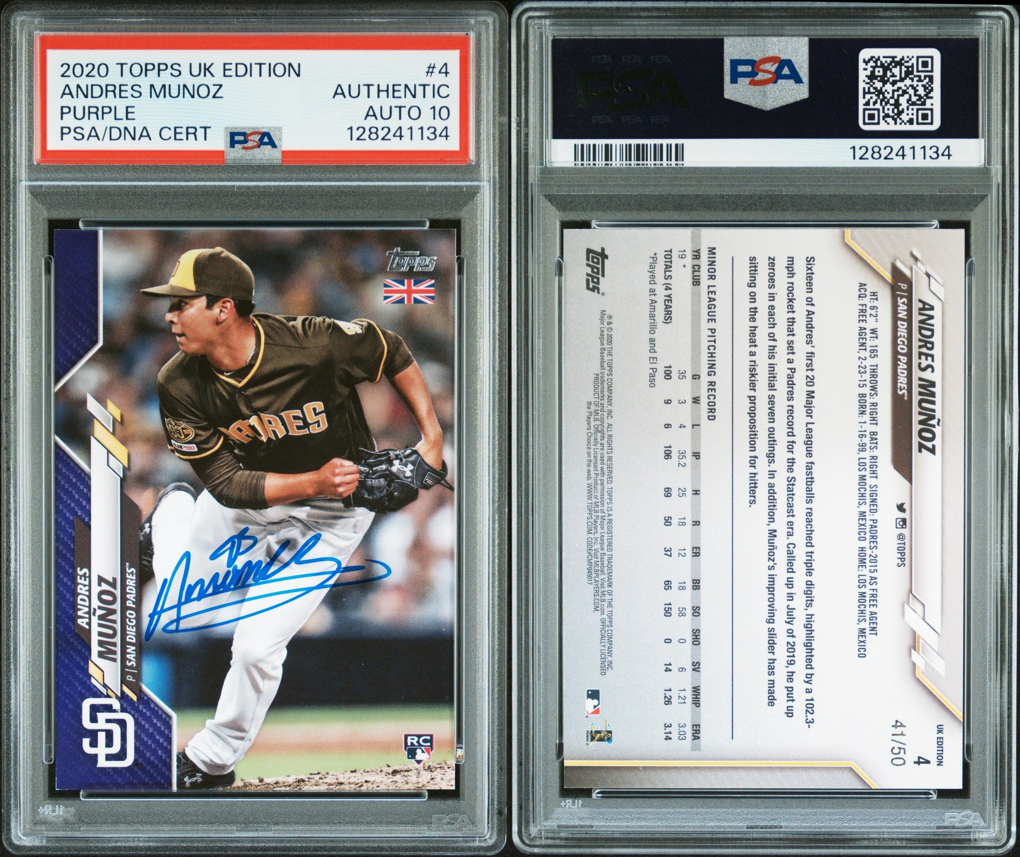 PSA DNA 10 2020 Topps UK Purple #4 Andres Munoz RC 41/50 San Diego Padres Autographed POP1