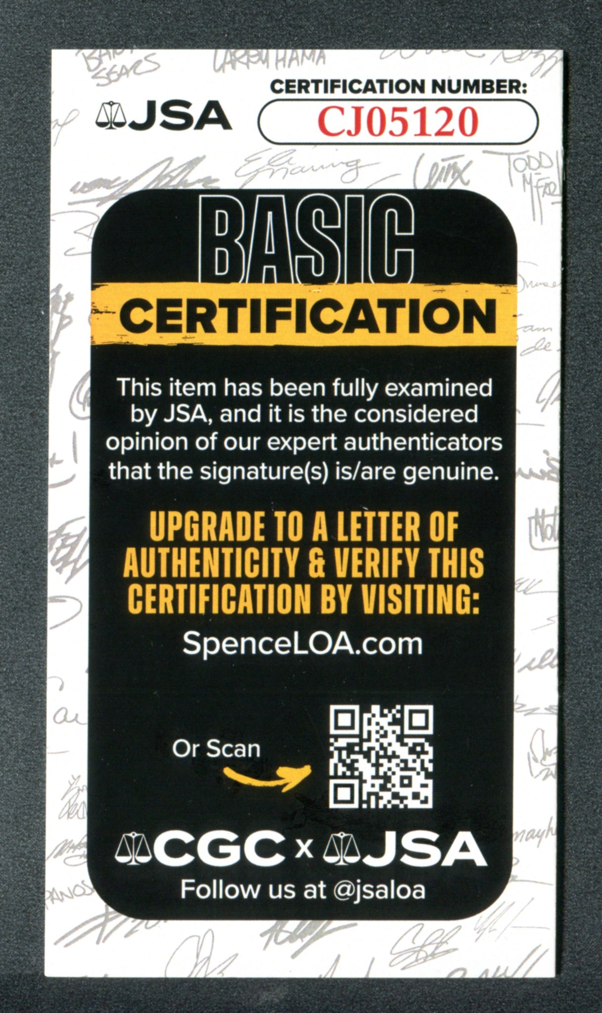 The autograph was authenticated by James Spence Authentication. A tamper proof alpha numeric sticker is on the card and is accompanied by a matched alpha numeric 3x5 trifold COA card.