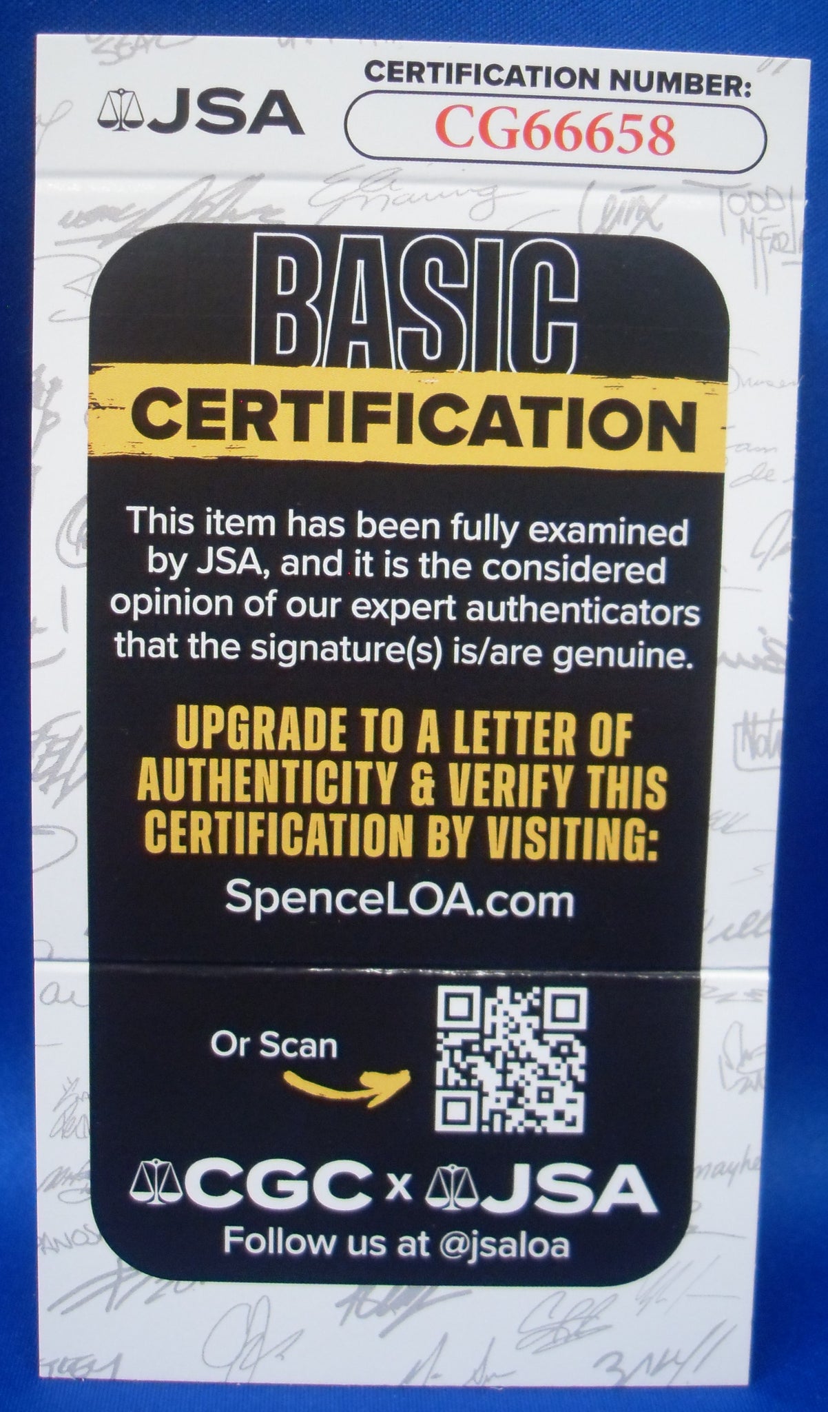 The autograph was authenticated by James Spence Authentication shortly thereafter. A tamper proof alpha numeric sticker is on the ball and is accompanied by a matched alpha numeric 3x5 trifold COA card.