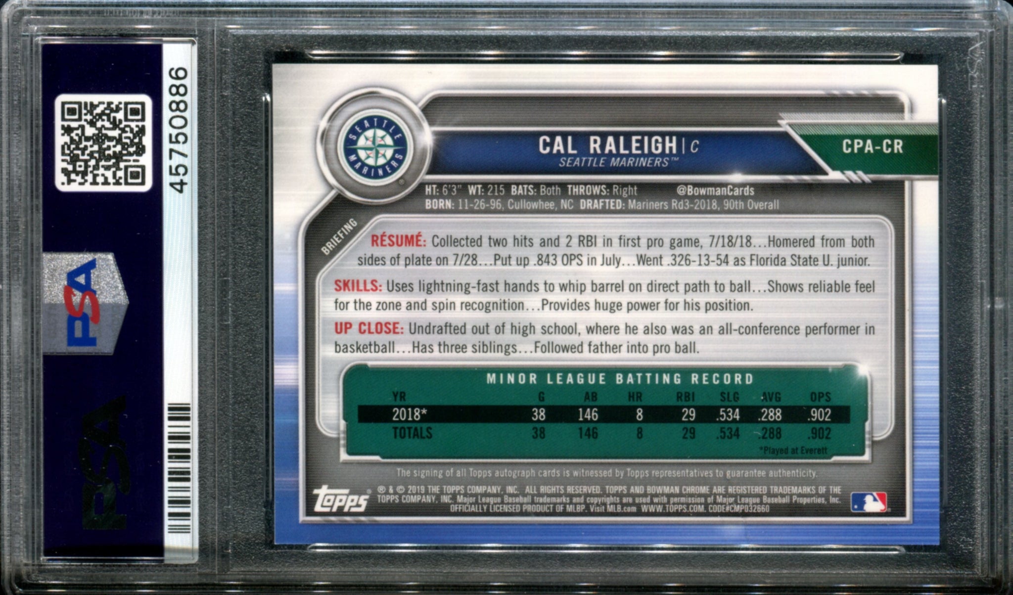 PSA 9 2019 Bowman Chrome Prospects Autograph Purple Refractor Cal Raleigh RC 49/250 POP27