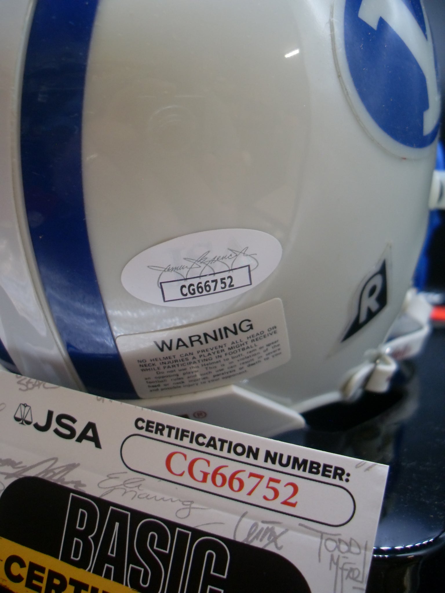 The autograph was authenticated by James Spence Authentication. A tamper proof alpha numeric sticker is on the mini helmet and is accompanied by a matched alpha numeric 3x5 trifold COA card.