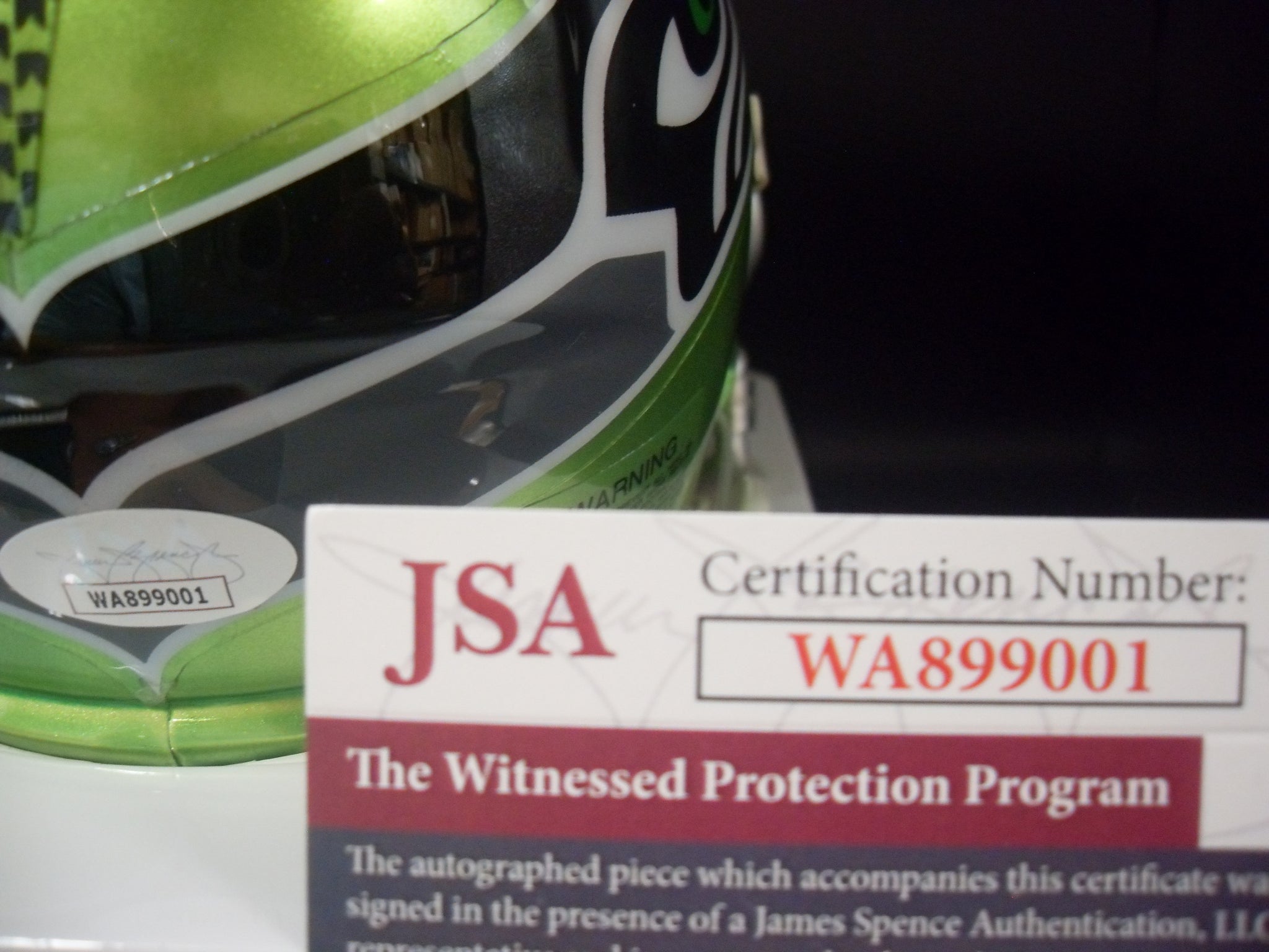 The autograph was authenticated by James Spence Authentication at that time using the WPP “Witnessed Protection Program” which verifies a JSA representative observed the item being signed in person. A tamper proof alpha numeric sticker is on the mini helmet and is accompanied by a matched alpha numeric 3x5 trifold COA card.